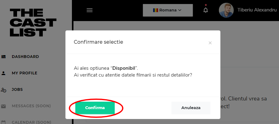 Accesezi linkul primit prin sms și email pentru a intra în pagina proiectului sau accesezi proiectul direct din profilul tău din pagina “Jobs” = “Joburile/Proiectele mele” pentru a vedea toate informațiile despre proiect și a răspunde. Răspunsul tău este vizibil în timp real în platformă, în profilul tău, atât pentru client, cât și pentru toți cei implicați în casting, iar statusul tău se actualizează pe loc din “Checking Availability” = “Se verifică disponibilitatea” în “Available” = “Disponibil” sau “Unavailable” = “Indisponibil”, în funcție de ce răspuns dai.
