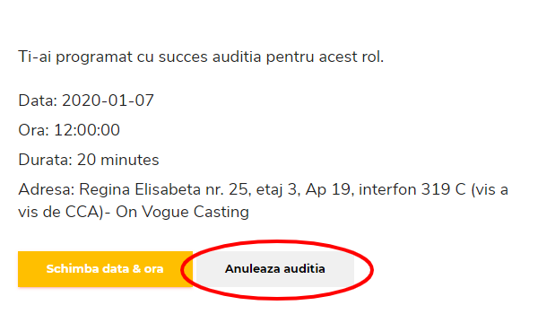 Dacă deja te-ai programat la probă și din diverse motive nu mai poți ajunge deloc, ai ca opțiune butonul: “Anulează audiția” = “Cancel Audition” => click pe el, iar statusul tău se transformă în “Audiție anulată”. Pentru informații suplimentare, ești rugat să anunți telefonic/sms/email responsabilul de casting care este situația ta.
